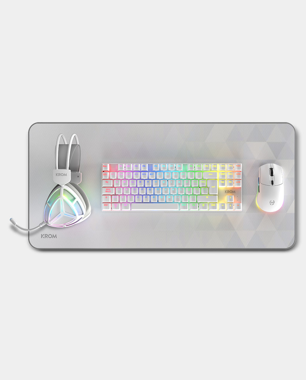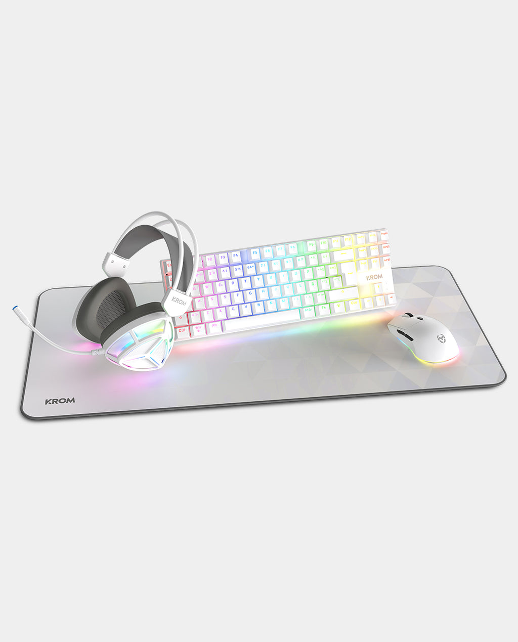 Krom Klass is the first gaming bundle from Krom to include a mechanical keyboard—perfect for adding a distinctive look to your setup with its stylish all-white design. This combo includes a tenkeyless mechanical keyboard with anti-ghosting technology, stereo headphones with built-in microphone, an ergonomic mouse with up to 7200 DPI, and a large speed-type mouse pad. Add personality to your setup with the full-white Krom Klass pack.